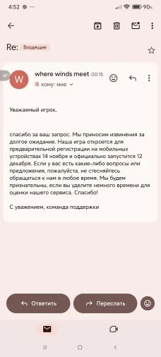 Ещё одна интересная новость пришла от нашего читателя. Он заявляет, что написал в службу поддержки Where Winds Meet по поводу релиза мобильной версии. И ему ответили, что игра станет доступна на iOS и Android 12 декабря. Такую же информацию указало немецкое издание mein-mmo.de. Редакция AppTime сделала отдельный запрос разработчикам, чтобы они подтвердили данную информацию.