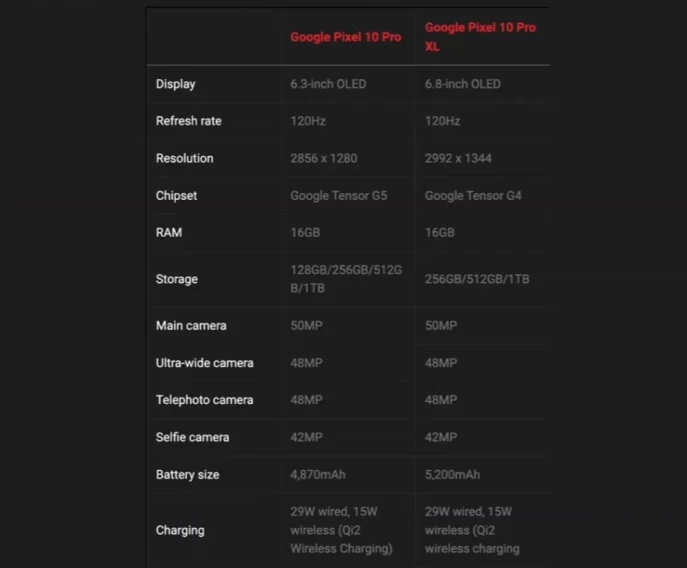 Характеристики Google Pixel 10 Pro чуть лучше и чуть хуже Pixel 10 Pro XL