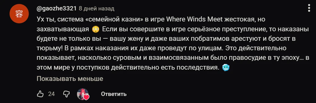 Китайские игры не только показывают культуру и историю Китая, но и суровые нравы, присущие той эпохе. Так, в Where Winds Meet есть наказание за убийство NPC. На вас будут охотиться боты-охотники за головами. Они нападают группой и отбиться от них почти невозможно. Если они «вырубят» вашего аватара, то свяжут и отправят в тюрьму.