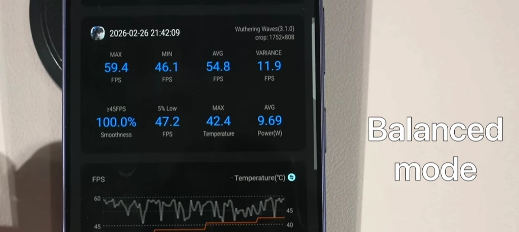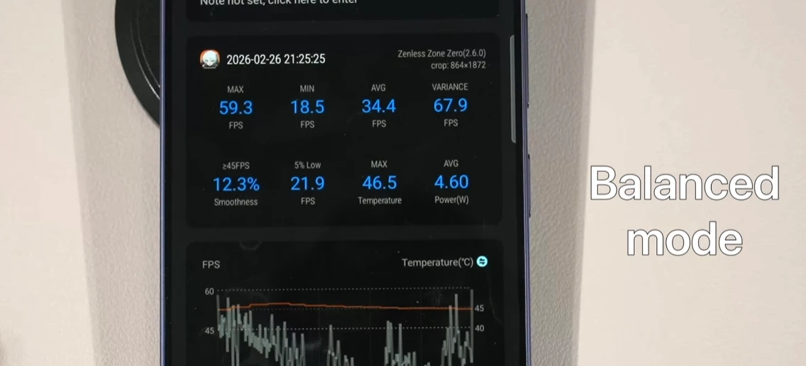 Zenless Zone Zero оказался более «крепким орешком». В тяжёлых сценах FPS опускался до 18,5 кадров. Лучше выбирать режим производительности, так как в нём S26+ выдаёт 45+ FPS почти во всех случаях. Но в таком случае потребление энергии вырастает до 9-10 Вт, из-за чего для длительных сессий нужно цеплять внешний кулер.