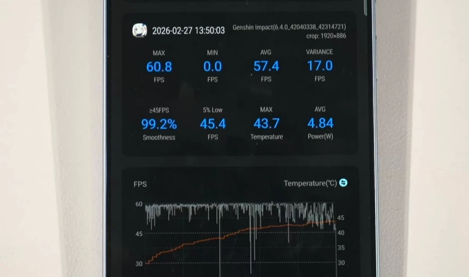 В Genshin Impact на максимальном пресете, локом на 60 FPS и API Vulkan смартфон показал стабильную работу, но с микрофризами. В бою энергопотребление достигает 7-8 Вт.