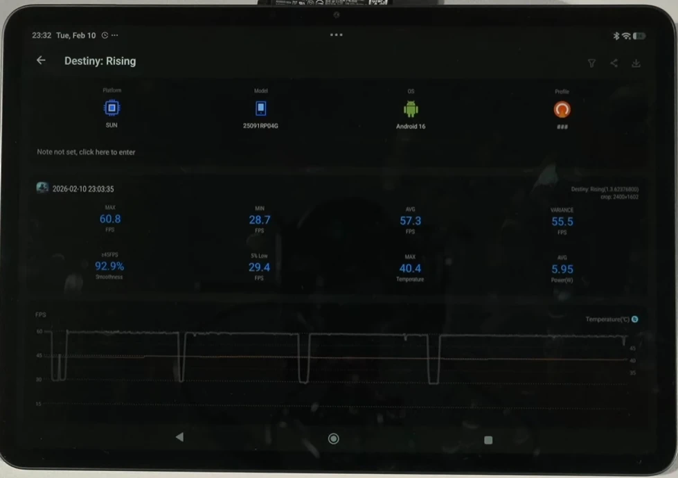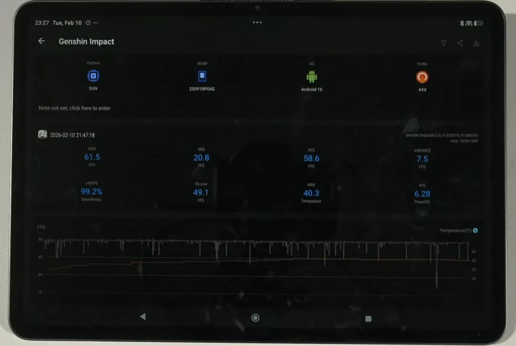 В Genshin Impact на максимальном пресете графики и с локом на 60 FPS получаем средний фреймрейт на уровне 58,6 кадров. Уровень энергопотребления достигает 6,28 Вт, а температура устройства не превышает 40.3 градусов. Это достойный результат, особенно если сравнивать планшет со смартфонами на этом же чипсете.