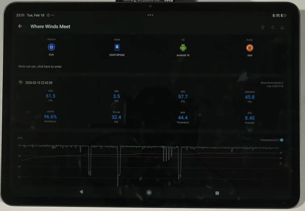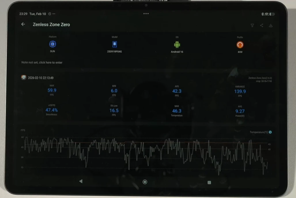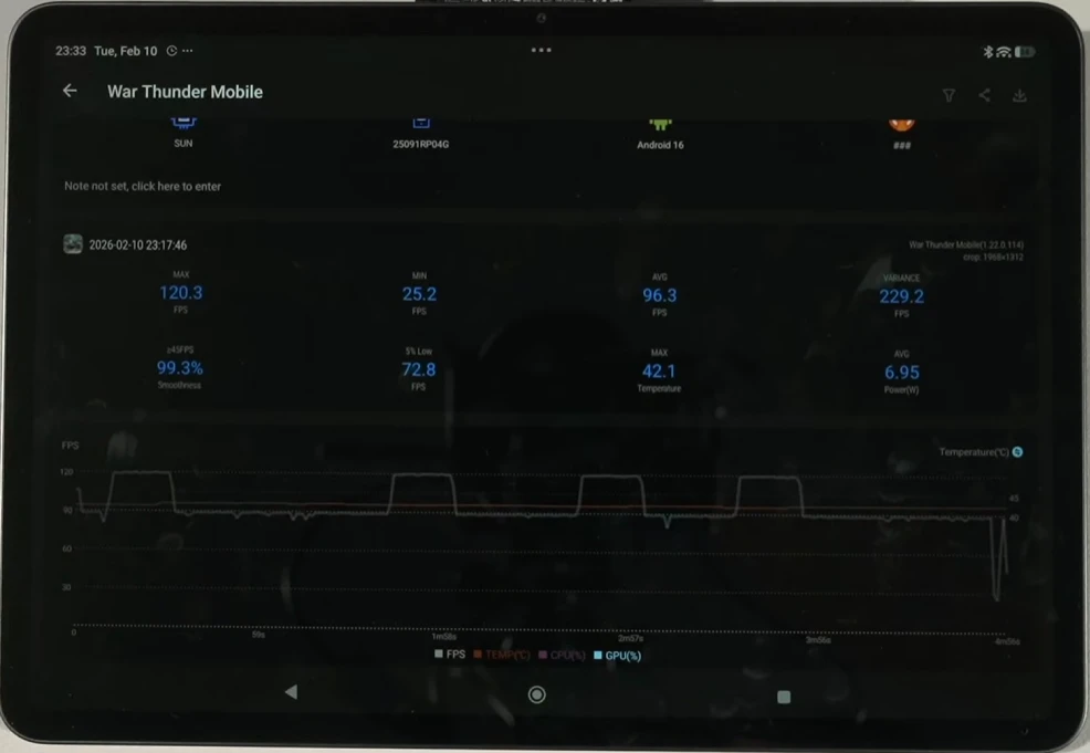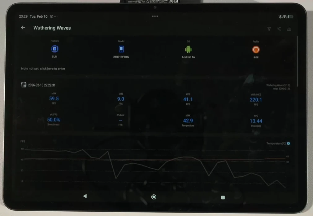 Wuthering Waves показала себя очень плохо на этом планшете — энергопотребление достигало местами 15 Вт, так что устройство быстро уходило в троттлинг. Для комфортной игры необходимо снижать настройки графики, на максималках уже не поиграешь.