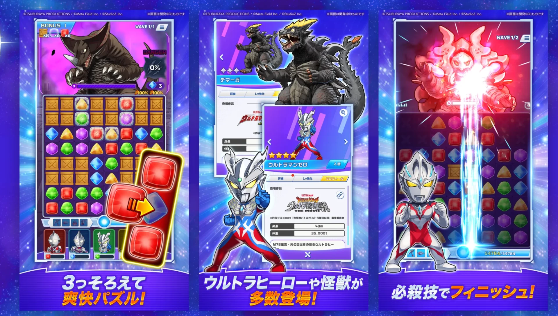 На промо-материалах можно увидеть, каким будет геймплей — вы собираете разноцветных ультраменов и объединяете одинаковые самоцветы, чтобы уничтожать кайдзю. Игрокам и фанатам «Ультрамен» обещают персонажей и кайдзю из каждой эры, так что фан-сервиса будет много.