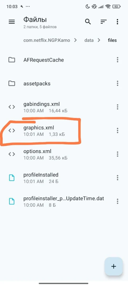 В том же Material Files переходим в папку com.netflix.NGP.Kamo и в подпапке «data» находим файл «graphics.xml». Откройте его через любой текстовый редактор. В моём случае это ZArchiver Text.