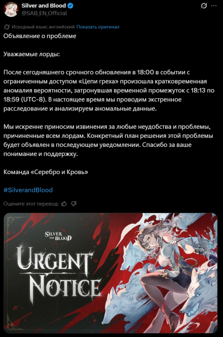 Сейчас такого «карнавала щедрости» в Silver and Blood уже нет. В настоящее время разработчики проводят экстренное расследование. Они приносят искренние извинения за любые неудобства и проблемы. Конкретный план действий опубликуют позже. Пока есть 2 варианта — все гача-крутки с 5 до 6 утра аннулируют и вернут за них валюту или выставят счастливым игрокам долг, как было в некоторых гачах до этого.