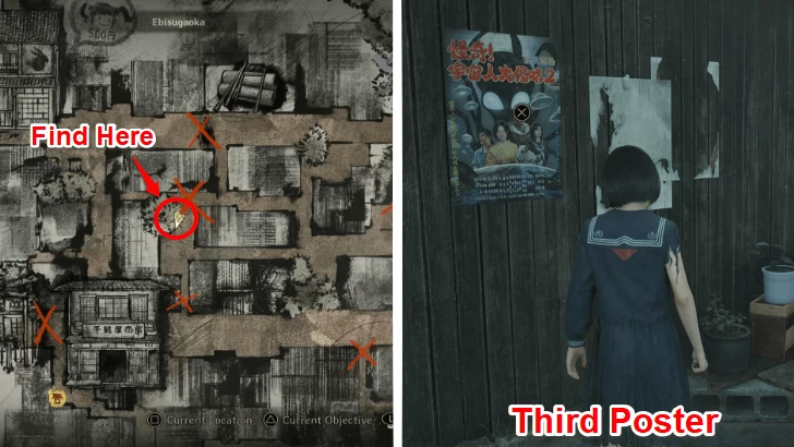 - Третий плакат — в 5-й главе приклеен к деревянному забору с растениями в горшках в юго-восточной части жилых переулков.