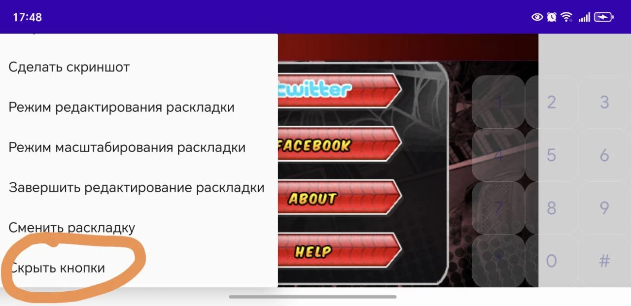 После запуска игры вы увидите много кнопок на экране — не бойтесь, они нам не понадобятся, так как Total Mayhem идеально распознаёт сенсорное управление. Поэтому жмём кнопку «Назад» или делаем соответствующий свайп, чтобы вызвать меню программы. В самом низу будет опция «Скрыть кнопки». В итоге нужно поставить галочку напротив всех кнопок.