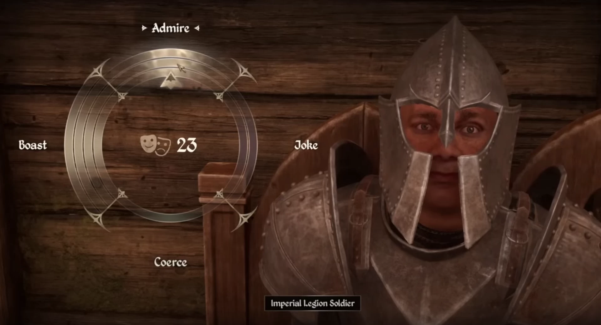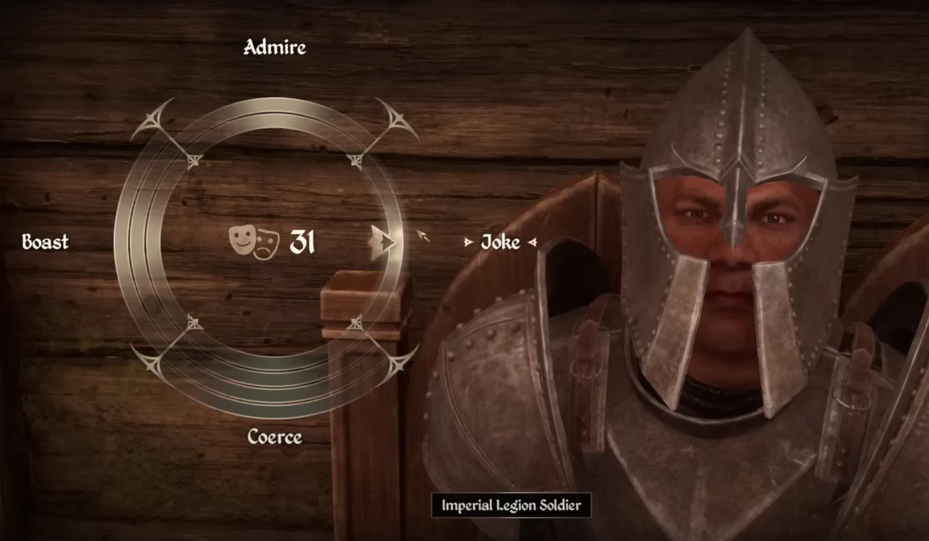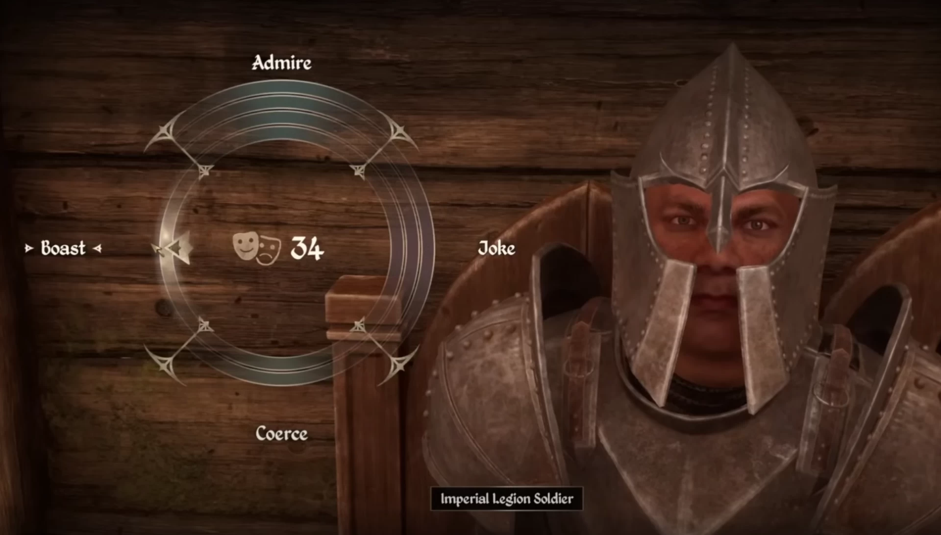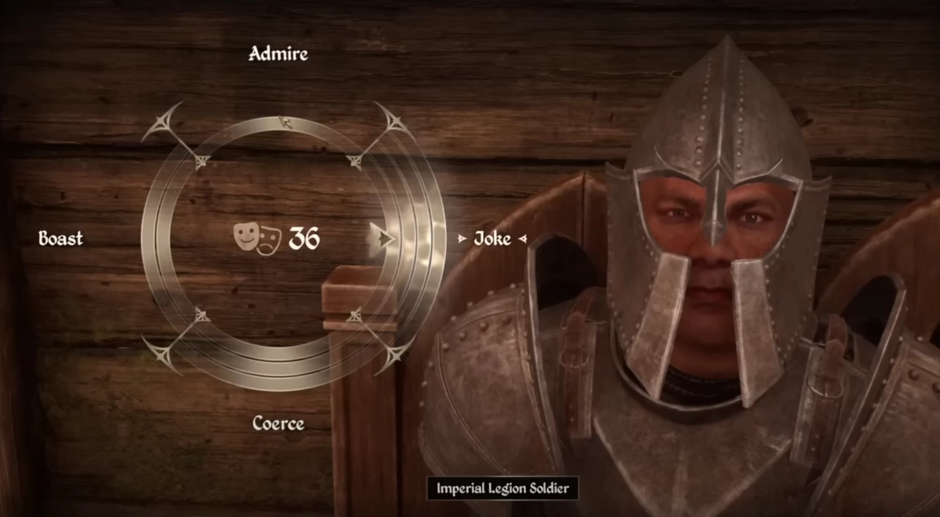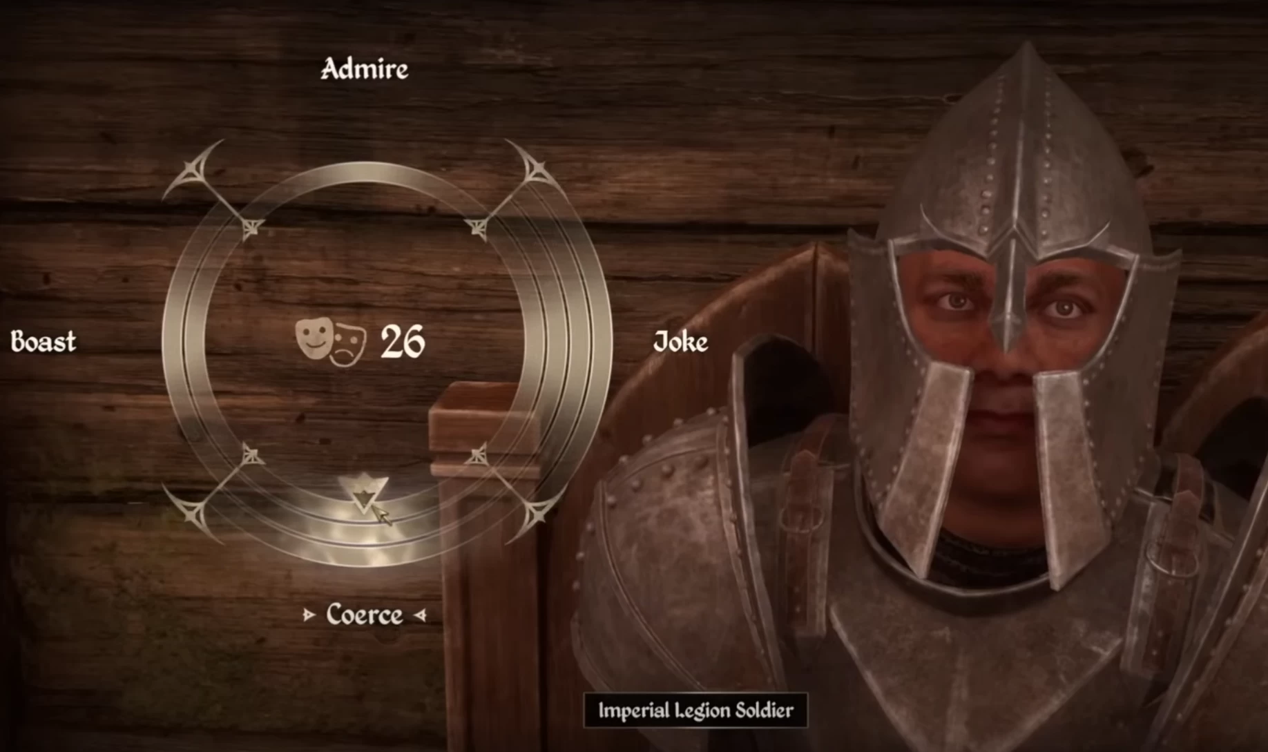 Вы видите колесо действий с четырьмя вариантами: лесть, шутка, угроза и хвастовство. Если навестись на каждый из вариантов, вы увидите, что выражение на лице NPC изменяется — он начинает сердиться или наоборот улыбается. Также вы увидите «кольца», количество которых (от 1 до 4) влияет на силу выбранного варианта. После каждого выбора эти кольца будут двигаться по часовой стрелке, поэтому хотя бы раз за мини-игру придётся выбрать отрицательный вариант.