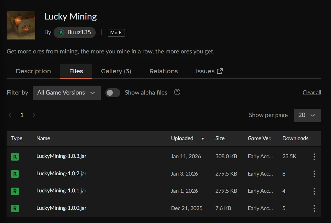 Разберём этот процесс на примере мода «Lucky Mining». Перейдите в раздел «Files», где находятся JAR-файлы. Нас интересует самый свежий для актуальной версии Hytale.