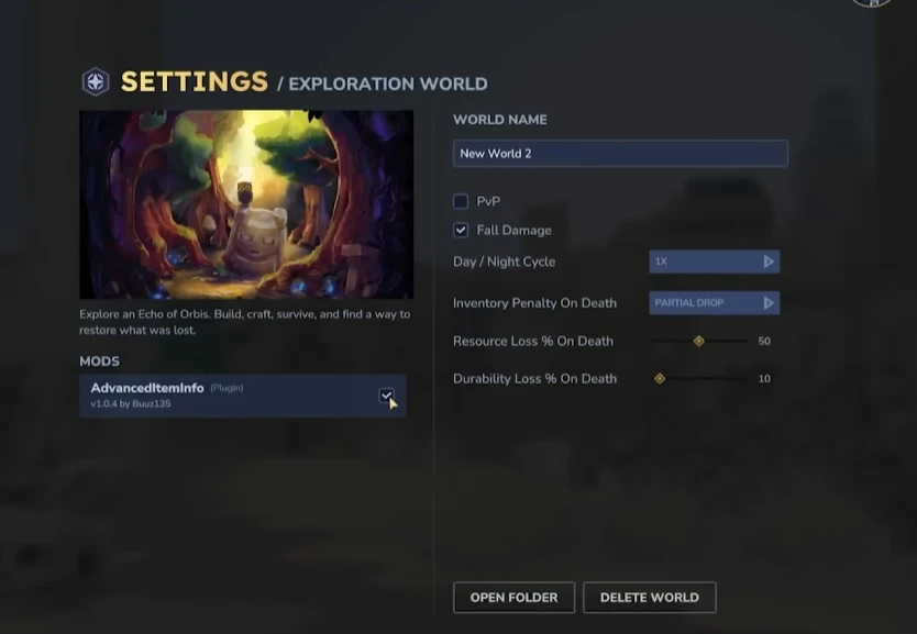 Теперь войдите в Hytale, нажмите ПКМ по нужному вам миру и слева выберите галочку напротив тех модов, которые хотите включить. Не забудьте выбрать «Сохранить настройки мира».