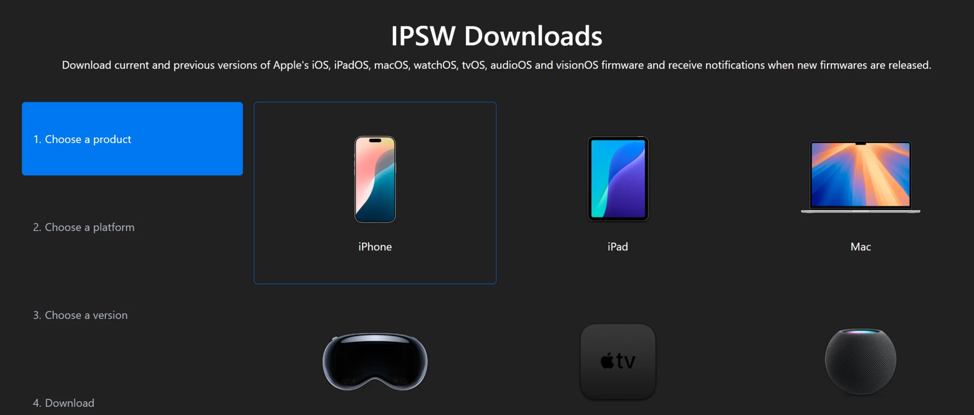 После этого перейдите на сайт IPSW Downloads и выберите нужное вам устройство — в нашем случае это iPhone.