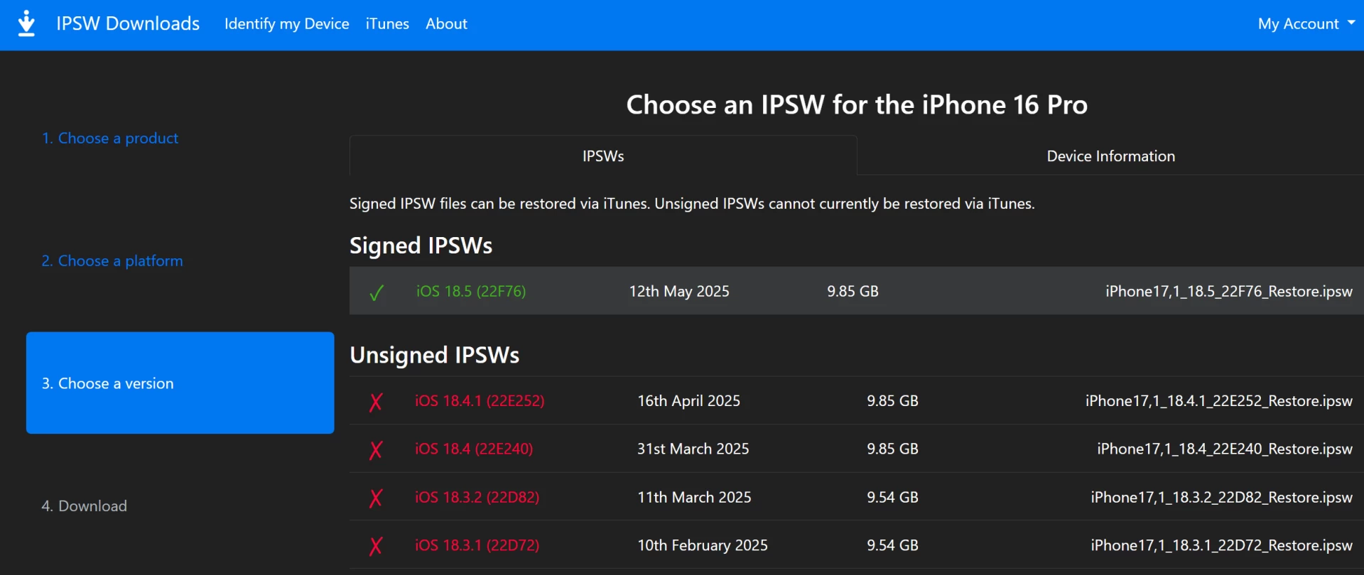 Далее скачиваем версию iOS 18.5, выделенную зелёным цветом. Она подписанная, поэтому свободно установится на ваш смартфон.