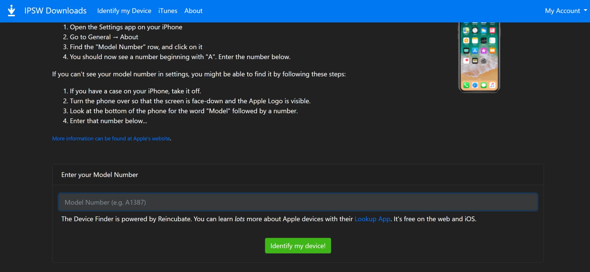 Если вы боитесь, что скачаете версию не для вашей модели iPhone, перейдите в раздел «Identify my Device» и введите номер своей модели. Его можно найти в настройках.