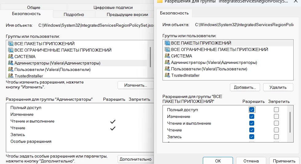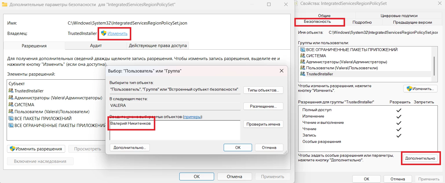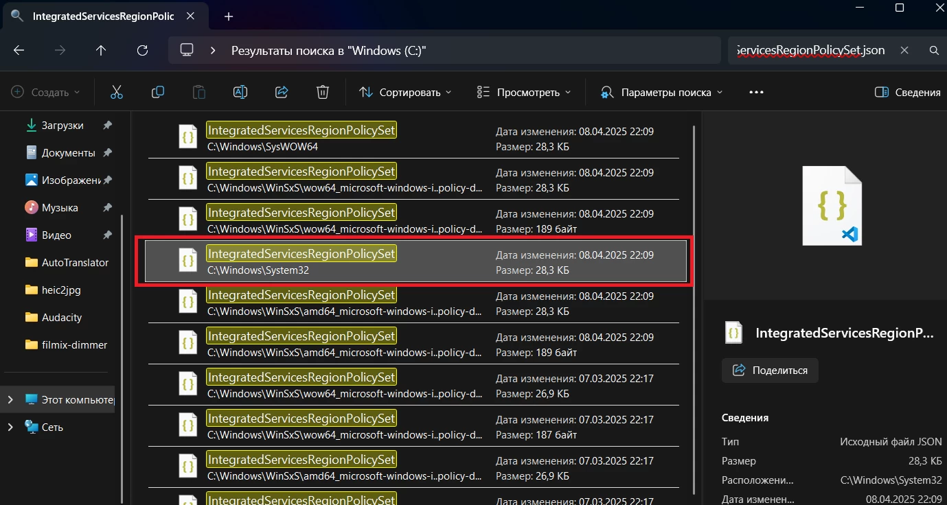 Первым делом — найдите файл IntegratedServicesRegionPolicySet.json на диске C. Их может быть несколько, но сейчас нам нужен только тот, что находится по пути «C:\Windows\System32». Открывать его не нужно, вместо этого нажмите ПКМ и выберите «Свойства».