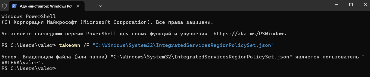 - Копируем команду takeown /F "C:\Windows\System32\IntegratedServicesRegionPolicySet.json", где текст в кавычках — это путь к вашему файлу.
