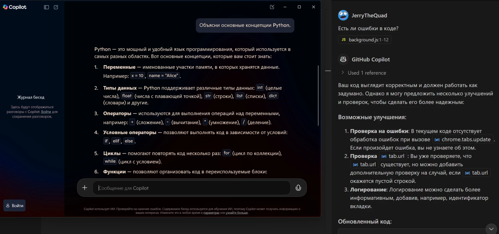 Благодаря такому способу вы сможете использовать Copilot в качестве отдельного приложения (скачивается отдельно в Microsoft Store) и в качестве ИИ-помощника в Visual Studio Code. К сожалению, отдельное приложение закрывается через несколько секунд после начала ввода запроса с российского IP. А вот Copilot в VSC заработал даже несмотря на уведомление «Программа не поддерживается в вашей стране» — просто у меня GitHub-аккаунт привязан к РФ. До данного способа я не мог завести Copilot в VSC даже с «виртуальным переездом».