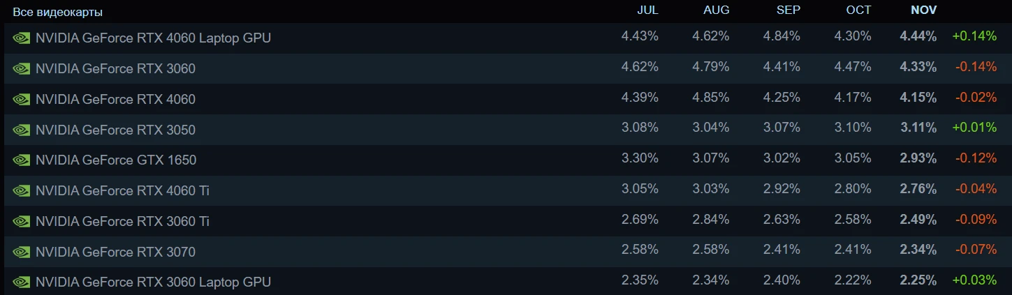 Сперва обратимся к статистике. Согласно собранной информации в Steam, самой популярной видеокартой стала «ноутбучная» NVIDIA GeForce RTX 4060. И хотя на рынке появилось много вариантов с картой NVIDIA GeForce RTX 5060, именно 4060 удерживает топ-1 среди вообще всех решений, даже обгоняя «ПК-шную» GeForce RTX 3060.