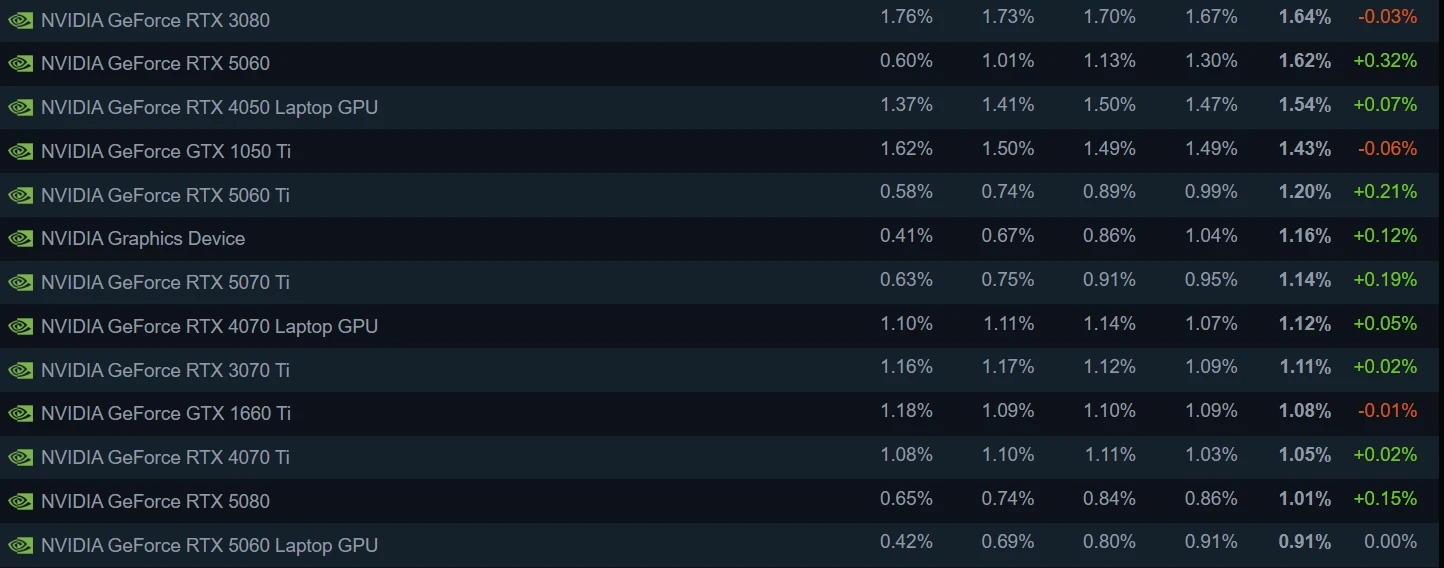 Несмотря на такую статистику, я предлагаю взглянуть на более «тихий тренд»: RTX 5060 Laptop. За несколько месяцев этот видеочип поднялся с 0,42% до 0,91%. Можно ожидать, что в следующем году эта цифра перейдёт отметку в 1% и будет стремиться уже к 2%.
