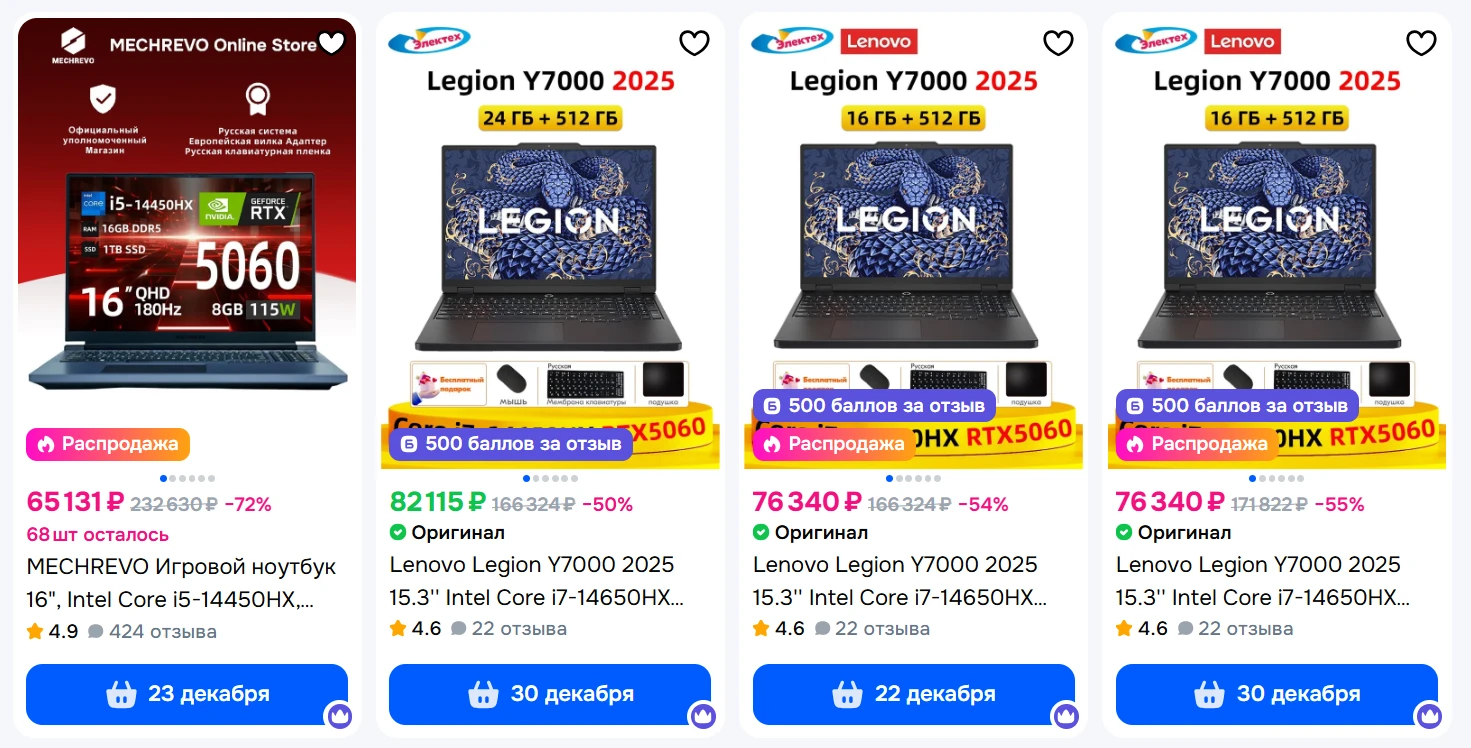 Более того, на OZON я нашёл ноутбук Lenovo Legion с Intel Core i7, 24 ГБ ОЗУ, 512 ГБ памяти и RTX 5060 за 82 115 рублей. Даже если прибавить таможенную пошлину в 11 285 рублей, мы всё равно попадаем в бюджет в 100 000 рублей.