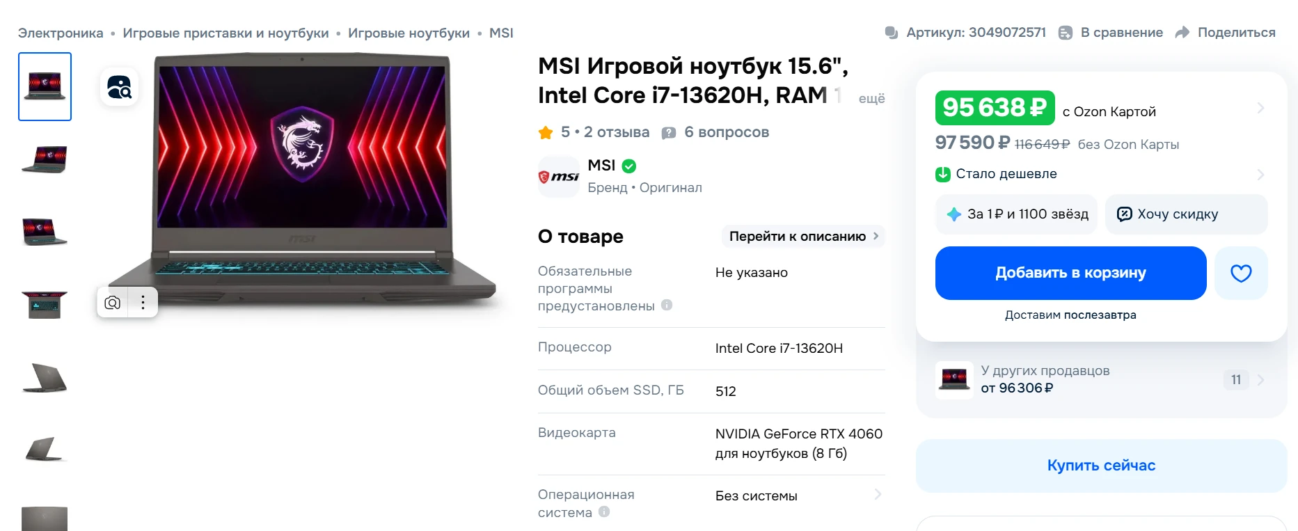 А теперь посмотрим на более или менее достойные решения с RTX 4060, которые продаются на маркетплейсе в России без необходимости платить таможенную пошлину. Так, ходовым вариантом можно считать игровой ноутбук от MSI, но в нём всего 16 ГБ ОЗУ и 512 ГБ SSD. Это значит, что уже в 2026-2027 гг. вам придётся расширять оперативную и внутреннюю память. А так как цена ноутбука составляет 95 638 рублей, то в итоге вы выйдете за рамки 100 000 рублей.