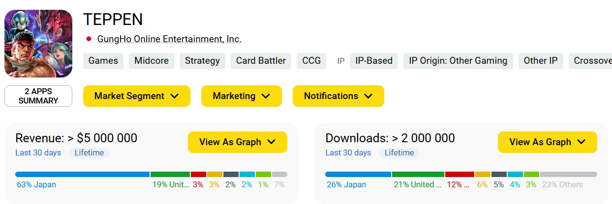 Игру скачали более 2 млн раз: 26% пришлось на Японию и 21% на США. Проект принёс $5 млн, на этот раз разброс между Японией и США больше — 63% против 19%.