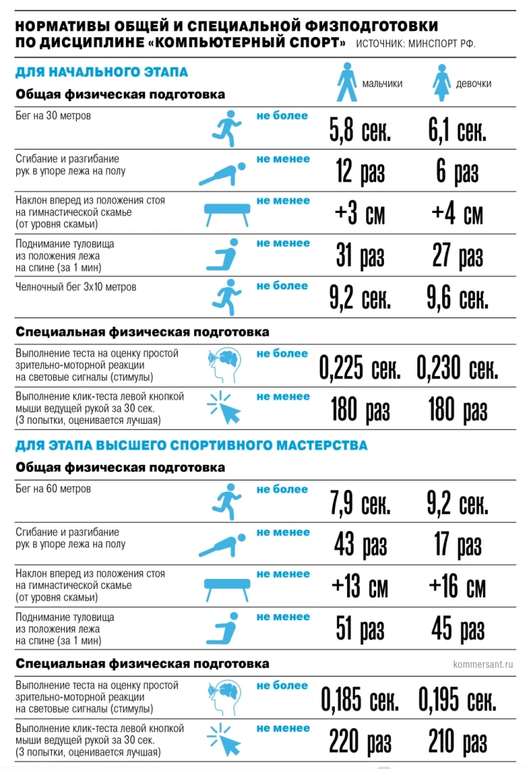 Если вы решите попасть в «высшую лигу» киберспортсменов, то требования будут ещё жёстче — 43 отжимания, 51 скручивание за 1 минуту, 220 кликов за 30 секунд и скорость реакции не более 0,185 секунд.