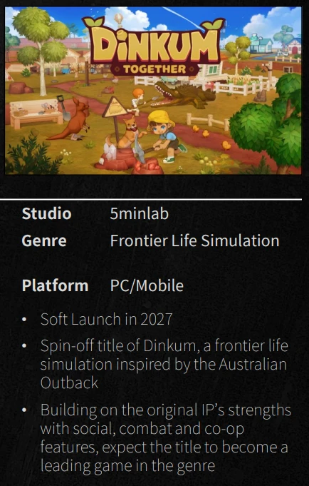 Dinkum Together представляет собой спин-офф популярного симулятора выживания Dinkum. Проект разрабатывает внутренняя студия KRAFTON — 5minlab. В рамках геймплея игроки смогут построить ферму на своём острове, исследовать местный мир с друзьями, встречать милых животных, а также заниматься охотой.