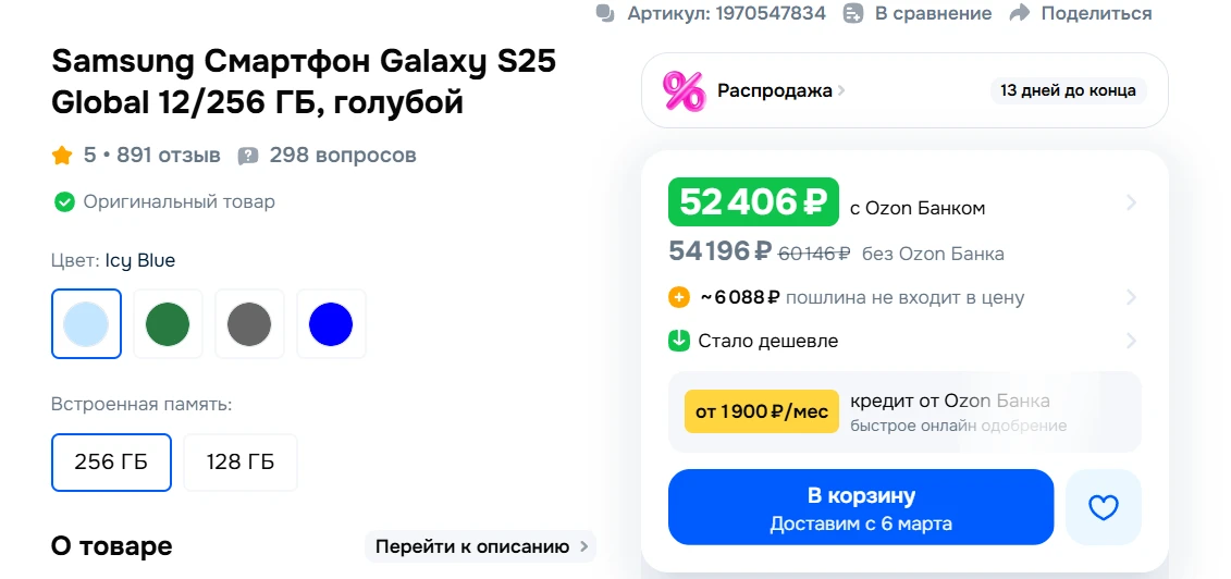 Samsung Galaxy S25 вышел год назад. Несмотря на то, что за это время вышло много альтернатив и флагманов, смартфон не успел устареть. Так, если заказать версию с 256 ГБ (хотя есть и версия с 128 ГБ), то через OZON она обойдётся в 52 406 рублей с таможенной пошлиной в 6088 рублей. Версия с 12 ГБ ОЗУ и 128 ГБ ПЗУ обойдётся в 51 400 рублей с учётом пошлины.