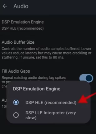 Откройте раздел Audio и выберите «DSP HLE» для быстрой эмуляции звука.