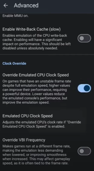 В разделе Advanced включите опцию «Override Emulated CPU Clock Speed» и в опции ниже выставьте значение 80%, если устройство слабое.