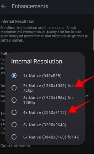 - Разрешение 2x для слабых устройств и 4x для мощных.
