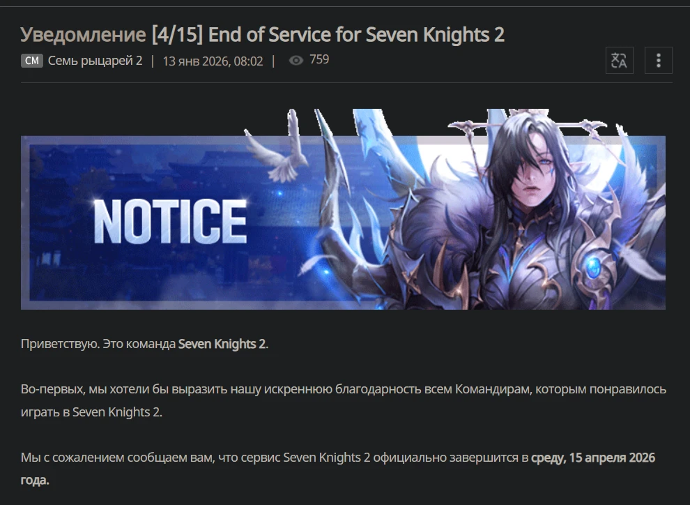 13 января на форуме Netmarble опубликовали пост, в котором говорится о скором закрытии мобильной игры Seven Knights 2. Сервера отключат 15 апреля 2026 года. С этого дня игру нельзя будет загрузить через мобильные маркеты. За день до этого закроют официальный форум и страницы в соцсетях.
