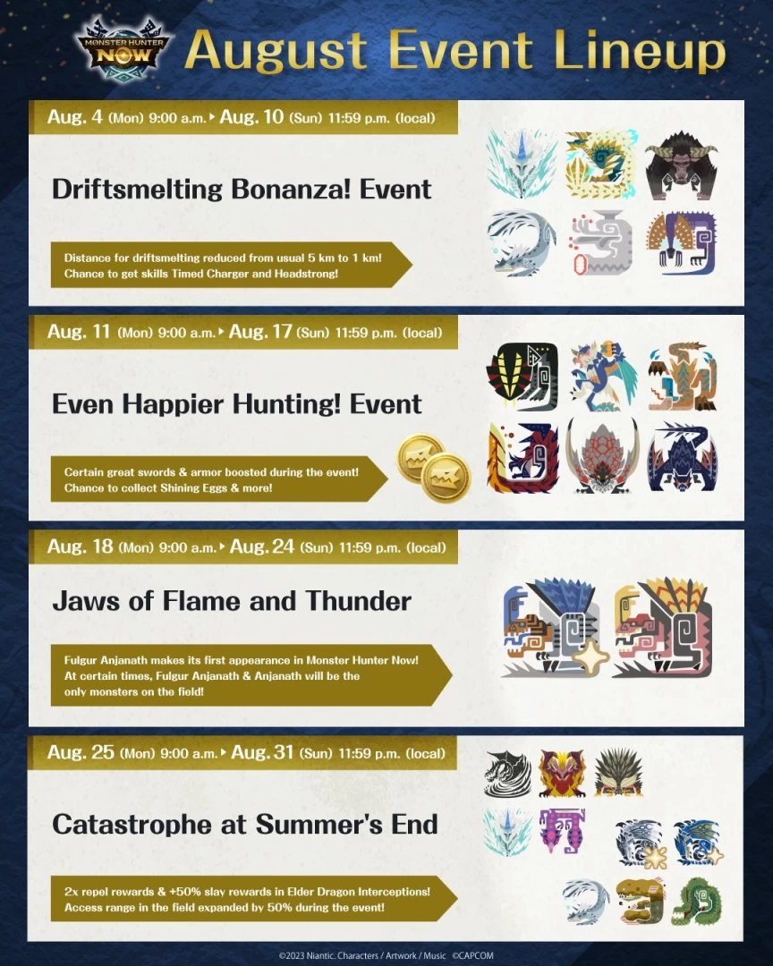 Первый ивент, Driftsmelting Bonanza, пройдёт с 4 по 10 августа. В ходе него монстры Kirin, Zinogre, Rajang, Tobi-Kadachi, Tzitzi-Ya-Ku и Khezu будут появляться чаще. Плюс, можно будет получить больше камней Driftstone.