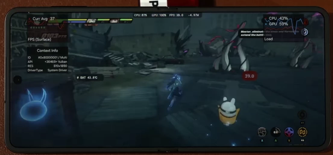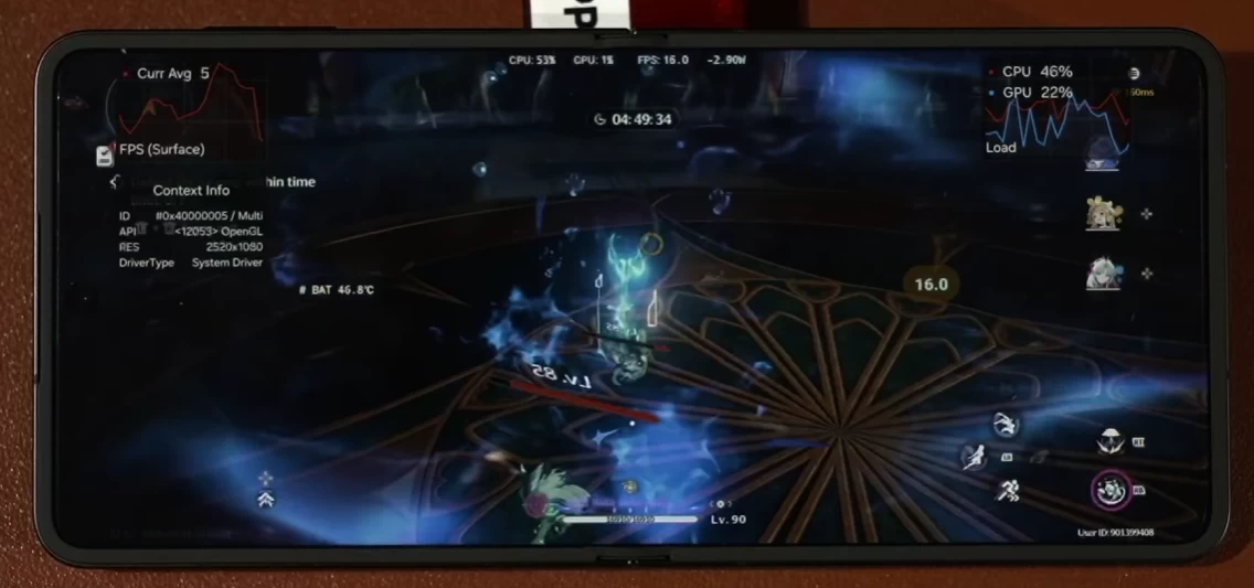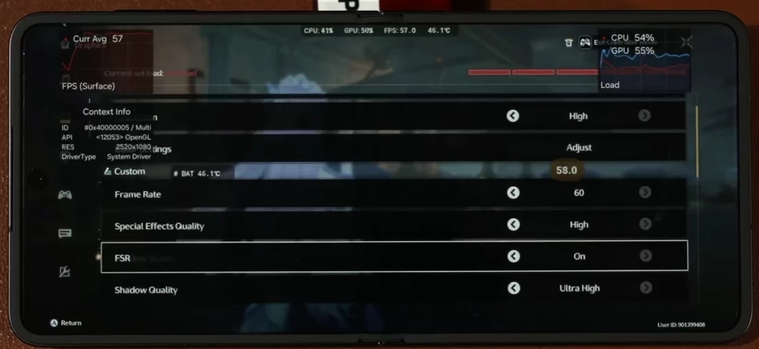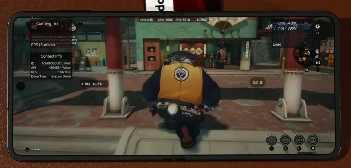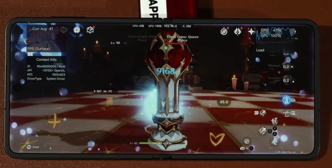Начнём с Genshin Impact — максимальные настройки с локом на 60 FPS. В битвах смартфон выдаёт 45-59 кадров. Видеочип загружен на 100%, а процессор держится в районе 50%.