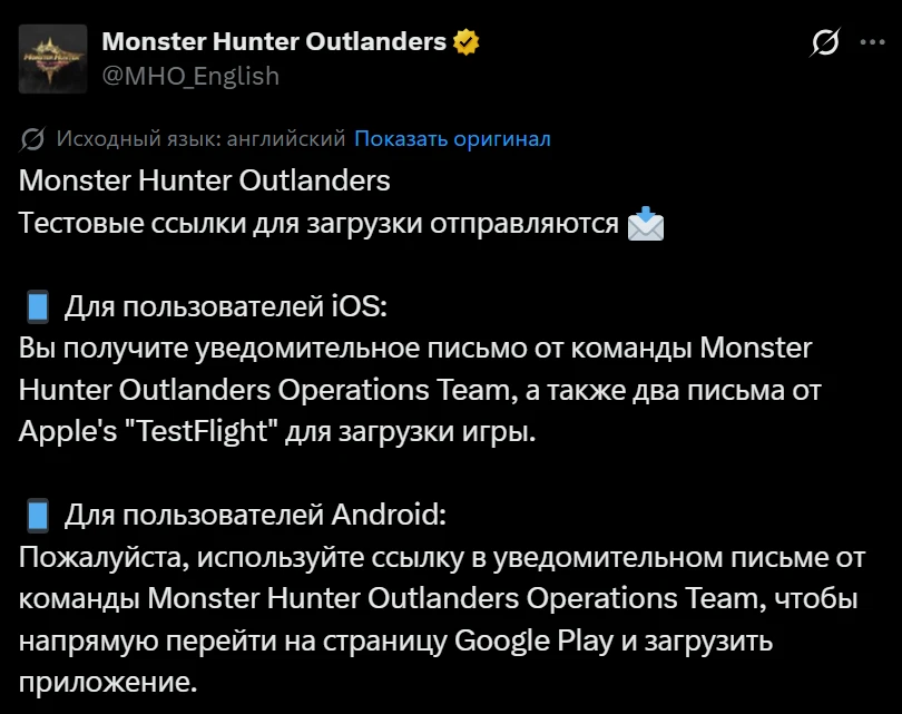 Разработчики Monster Hunter Outlanders начали рассылать письма со ссылкой для скачивания тестовой версии игры. Игрокам на iOS придёт письмо от команды Monster Hunter Outlanders Operations Team, плюс для письма от сервиса TestFlight для загрузки игры. Игрокам на Android также придёт письмо, а скачать клиент они смогут через Google Play.