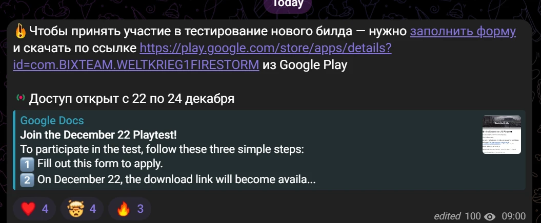 В середине декабря разработчики Weltkrieg 1: Firestorm рассказывали в своих западных соцсетях о том, что они собираются провести очередной тест 20-го декабря. Теперь в русскоязычном ТГ-канале они сообщили другую дату — тестирование проходит с 22 по 24 декабря. Участвовать могут только Android-игроки. Скачать бета-клиент можно через Google Play, но для доступа к странице игры нужно сначала заполнить форму и подождать какое-то время, пока её рассмотрят. Отмечу, что анкета короткая: в ней задают 5 вопросов про возраст, игровые предпочтения, участие в прошлых тестах, важный аспект в шутерах и тип игры (соло или с друзьями).