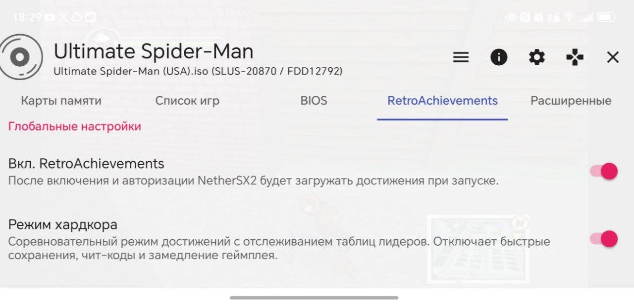 Благодаря NetherSX2 можно проходить ретро-игры с PlayStation 2 на Android, но порой это не так интересно, как хотелось бы. Дополнительную «искру» зажигают достижения, которые можно интегрировать с зарубежным сервисом RetroAchievements, что я и сделал. По сути это отдельная экосистема, в которой есть база данных игр с разных ретро-консолей — от Nintendo Game Boy до PSP и PS2. Вы сможете следить за своим прогрессом, смотреть статистику по последним играм, какие достижения осталось выбить, а также показывать другим пользователям RA, чем вы занимаетесь: например, я «патрулирую Нью-Йорк в роли Человека-паука» в Ultimate Spider-Man. Это значит, что игра запущена и я наслаждаюсь геймплеем. Чуть ранее у меня был другой статус: «Находится в главном меню и готовится к приключениям».