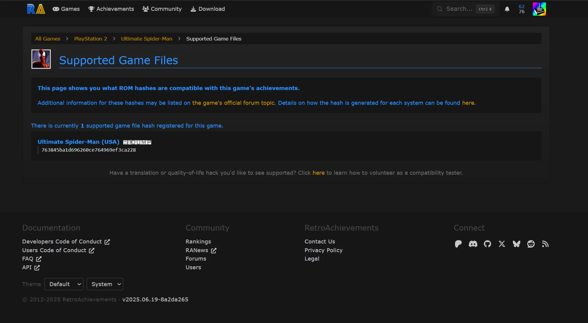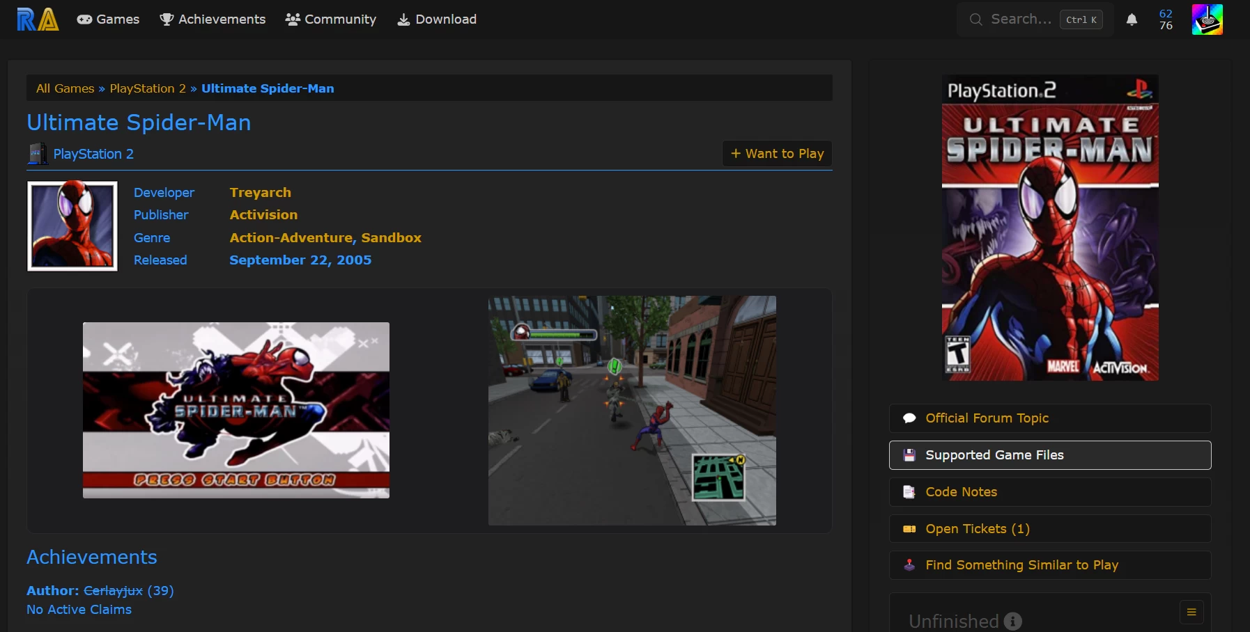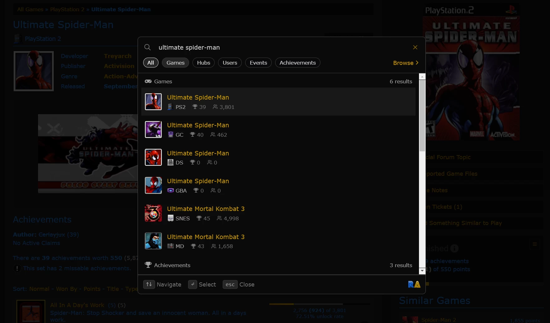 К сожалению, RetroAchievements работает только с определёнными образами PS2-игр — в основном это американские версии «Redump». Чтобы понять, какая версия игры вам нужна, откройте сайт RetroAchievements и в местном поисковике введите название проекта. В моём случае это Ultimate Spider-Man. Выберите ту версию игры, которая вам подходит — Game Boy Advance, Nintendo DS, PlayStation 2 и так далее.