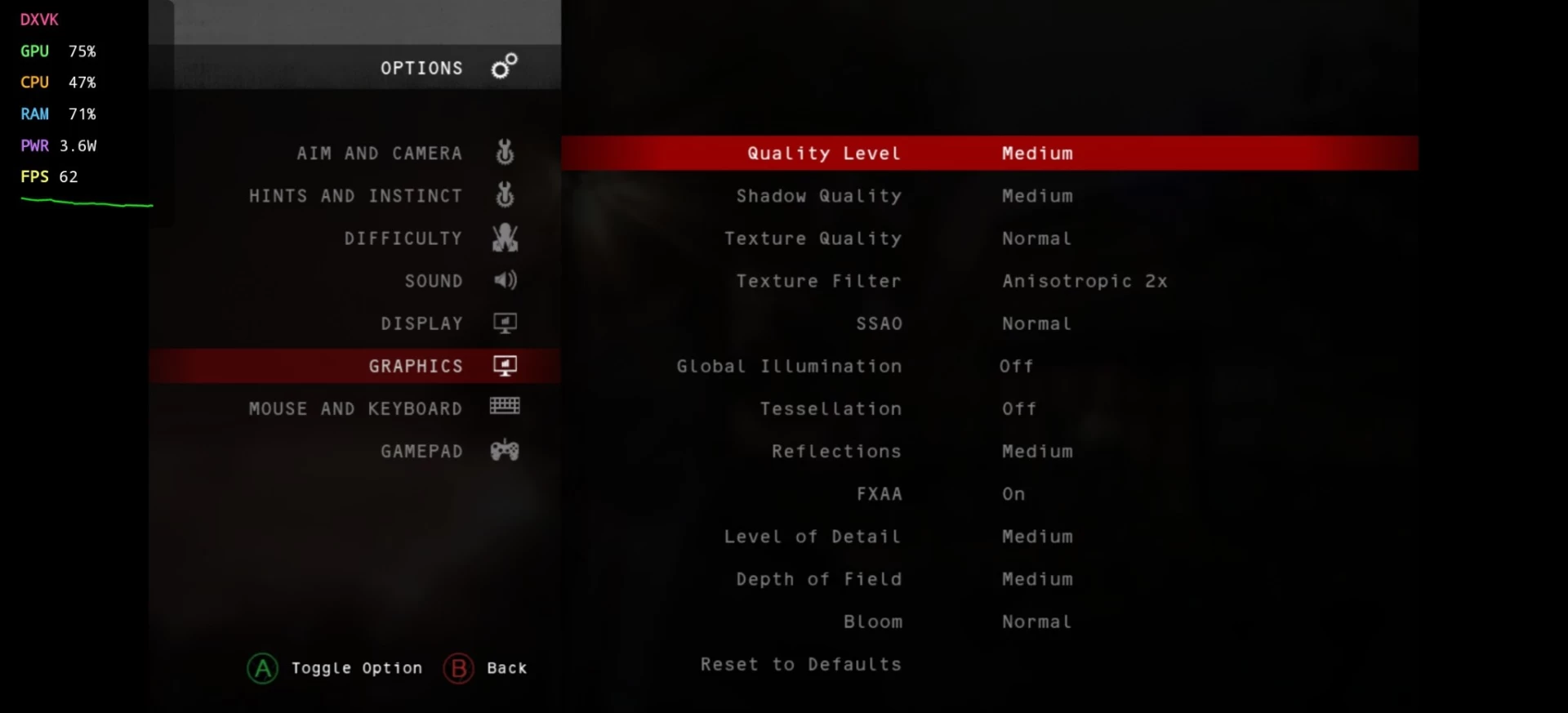 В настройках самой игры мы выставили средне-высокие настройки графики. В итоге получили 43-55 FPS на открытых локациях. Если выставить минимальный пресет графики, то FPS стремится к 100 кадрам. Потребление энергии 3,9 Вт, что очень щадяще даже по сравнению с современными мобильными играми. Это значит, что порт Absolution от Feral будет ещё лучше оптимизирован, особенно для бюджетных смартфонов.