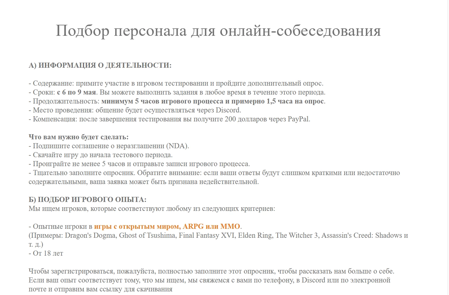 Потенциальным тестировщикам нужно будет поиграть минимум 5 часов в промежутке с 6 по 9 мая, а также потратить примерно 1,5 часа на опрос через Discord. После завершения тестирования издатель заплатит $200 через PayPal.