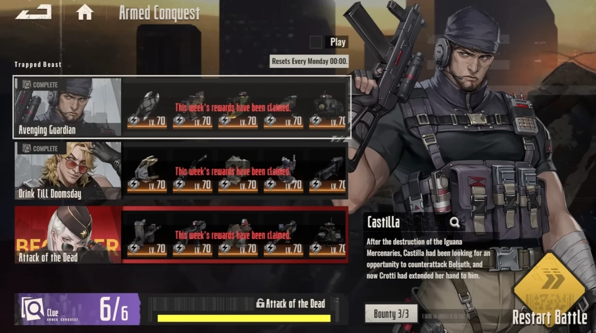 За прохождение уровней вы получаете оружие и гача-билеты. У каждого босса есть свой пул наград. «Armed Conquest» — еженедельный режим, поэтому сбрасывается каждый понедельник в 00:00 по серверному времени. Также важно знать, что если вы зачистили все уровни в прошлый раз, то на следующей неделе сможете использовать «Быстрое прохождение», чтобы сразу получить все награды.