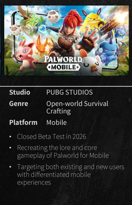 Издатель KRAFTON отчитался о финансовых результатах за четвертый квартал 2025 года. В опубликованной презентации указано, что игру Palworld Mobile ждёт закрытый бета-тест в 2026 году. Также подтвердили жанр — выживание с крафтом предметов в открытом мире. Разработчики из PUBG Studios перенесут историю мира Palworld и основной геймплей на смартфоны. Целевая аудитория — старые и новые пользователи с разным игровым опытом на мобильных устройствах.