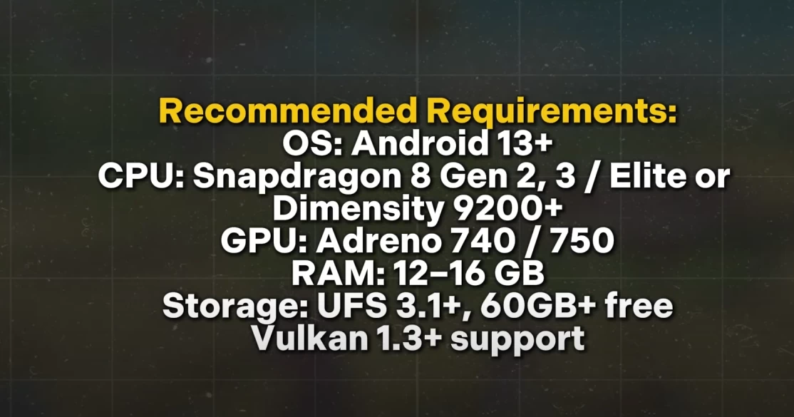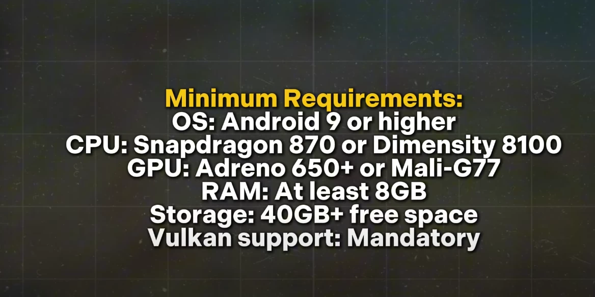Вам нужен смартфон или планшет с Android 9, процессором Snapdragon 870 или Dimensity 8100, видеочипом Adreno 650+ или Mali-G77, 8 ГБ ОЗУ, 40+ ГБ свободного места и обязательной поддержкой Vulkan.