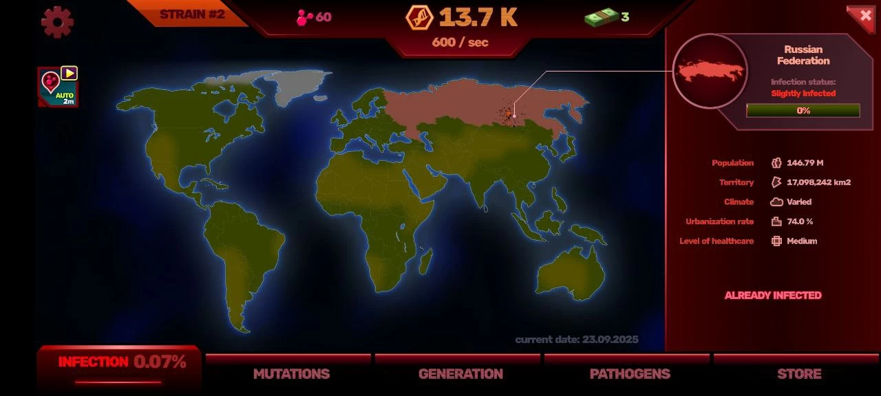 В Patient Zero: Plague вместо поиска лекарства вы будете заниматься привычным делом — заражать крупные страны, включая Россию. Процесс очень медленный, поэтому нужно исследовать мутации и генерировать новые вирусные клетки. Если заразить весь мир, вам откроются новые типы вирусов.