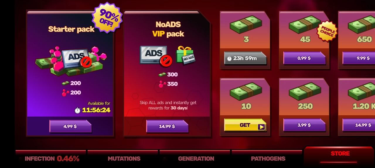 В Patient Zero: Plague есть внутриигровой магазин, в котором каждый день можно бесплатно забирать премиальную валюту, а также купить набор, который отключает рекламу. Более того, вы можете сразу получить награду за 30 дней.