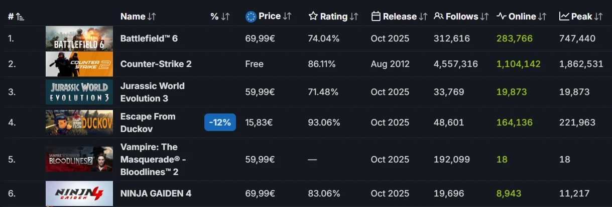 Пиковый онлайн Ninja Gaiden 4 в Steam составил 11 217 игроков. Пока что игра занимает топ-6 место среди «самых продаваемых» новинок — её обгоняют Vampire: The Masquerade - Bloodlines 2 и Jurassic World Evolution 3.