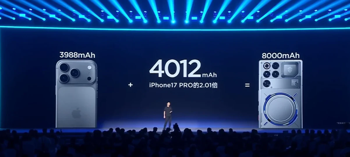 Если говорить об аккумуляторе, то его ёмкость составляет 8000 мА*ч с зарядкой по проводу на 120 Вт и 80 Вт без провода, а также с поддержкой «обходной зарядки». Заявлено, что ёмкость аккумулятора в 2,01 раза больше, чем у iPhone 17 Pro.