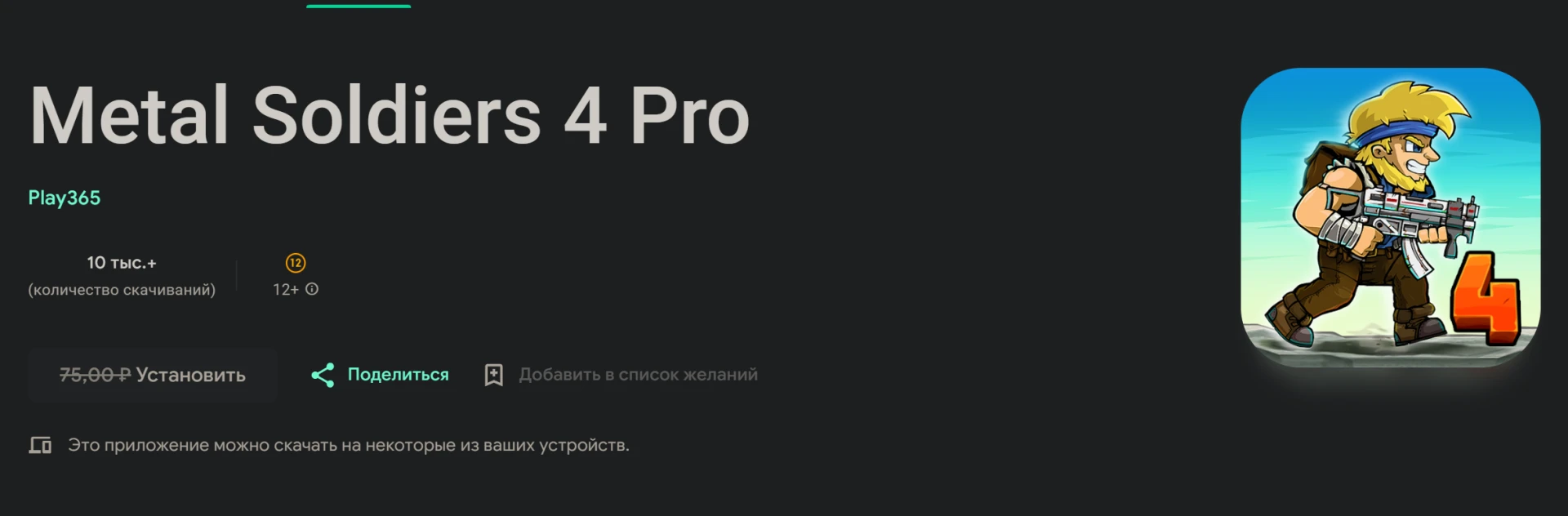 F2P-версия Metal Soldiers 4 с рекламой и внутриигровыми покупками вышла на Android в августе 2025 года. С тех пор её скачали более 100 000 раз. 28 января этого года студия Play365 выпустила премиальную версию с припиской «Pro». Она стоит 75 рублей, но на какое-то время разработчики сделали её бесплатной — скачать клиент можно через Google Play РФ и других стран. В нём нет рекламы и доната.