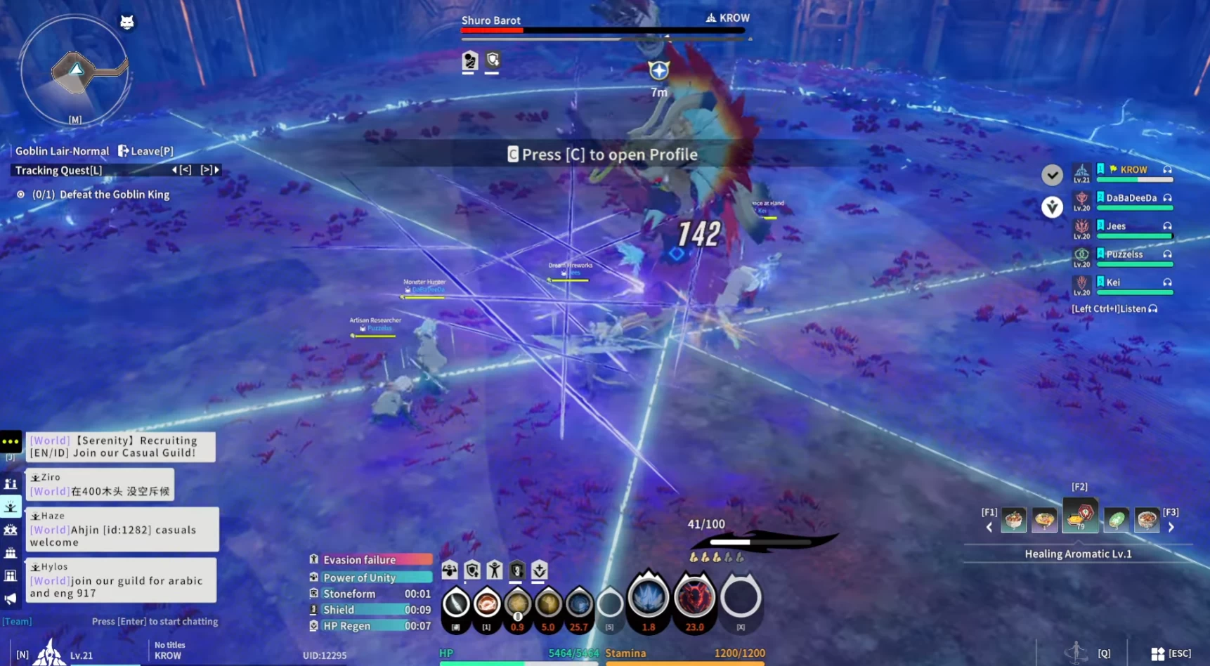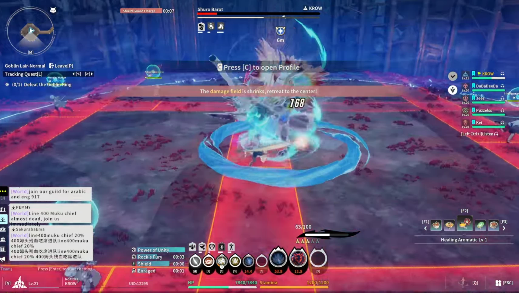 В какой-то момент с одной стороны босса появляется щит, а он начинает кастовать заклинание с призывом огромного шара. Ваша задача — отбить этот шар 2 раза щитом, чтобы попасть в спину Shuro Barot. Это могут сделать как 2 игрока, так и 1, если он быстро соображает. Если попасть в щит, отряд получит много урона, слабые герои умрут. Эту механику важно знать, потому что в мини-данже Unstable у босса нет щита и поэтому не все игроки поймут, что им нужно делать.